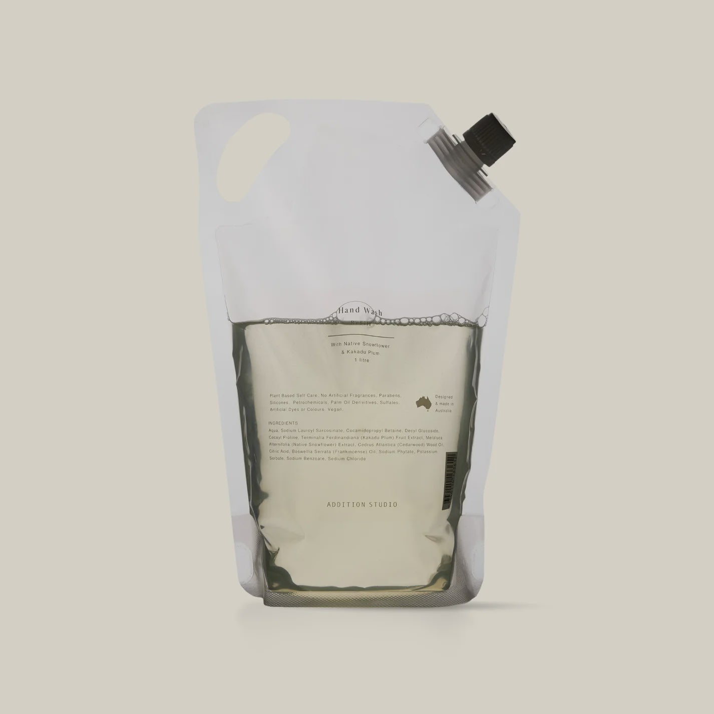 The 1 litre refill is presented in a a clear stand-up pouch, and features an easy to pour spout.
