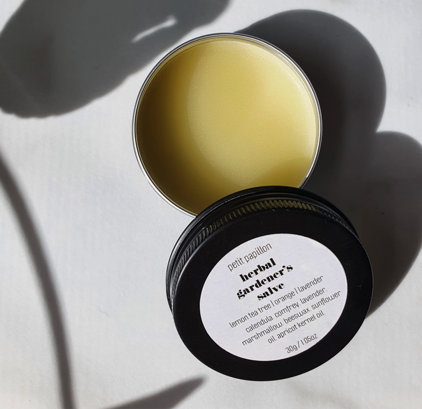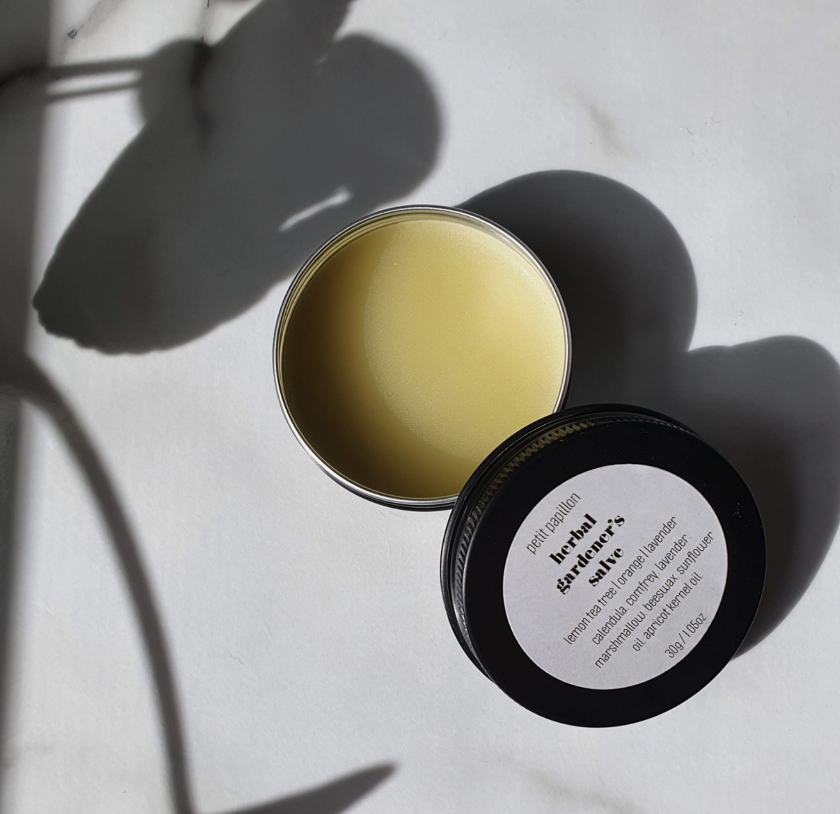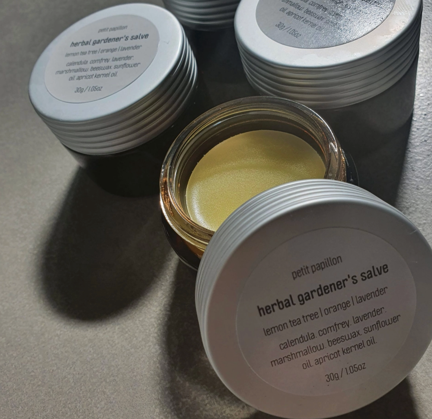 Our gardener's salve is a slow solar herbal blend of calendula, comfrey, marshmallow and lavender infused in a blend of apricot kernel and sunflower oils.