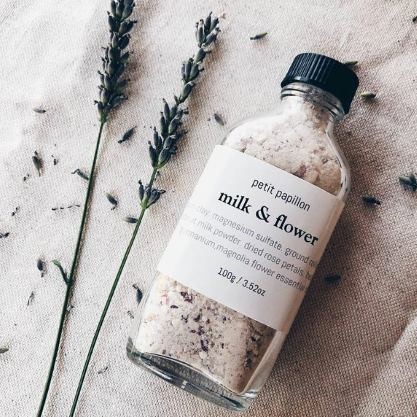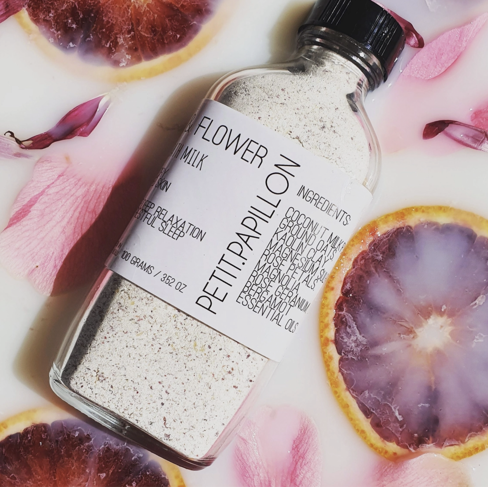 Milk and Flower bath will soothe dry + irritated skin conditions, whilst exfoliating to add extra softness to the skin