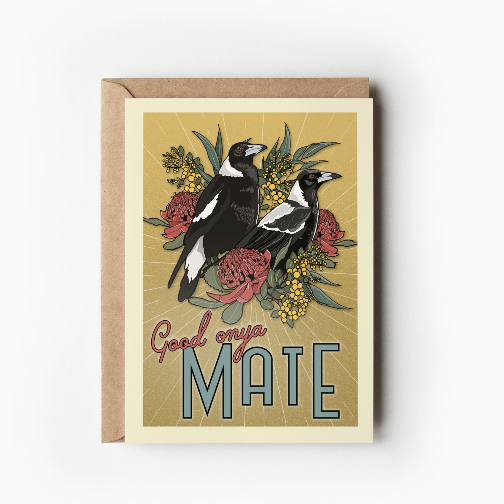 This greeting card features a pair of Magpies nestled in some native flora. Adding a touch of Australian charm to your heartfelt message.