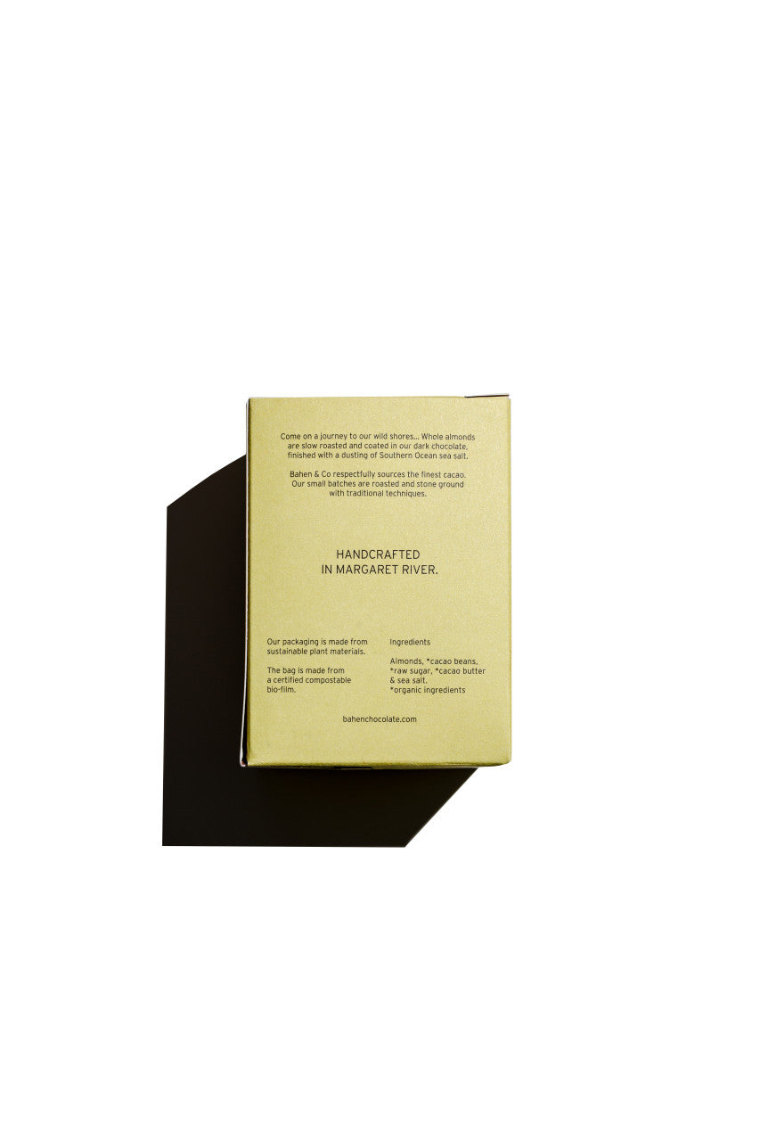 Come on a journey to our wild shores… Whole almonds are slow roasted and coated in our dark chocolate, finished with a dusting of Southern Ocean sea salt.