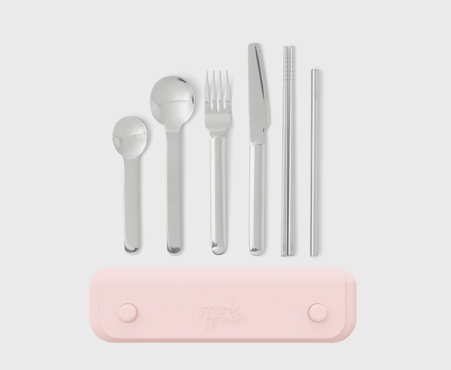 Your complete on-the-go set includes: knife, fork, soup spoon, teaspoon, chopsticks, straw & pouch.