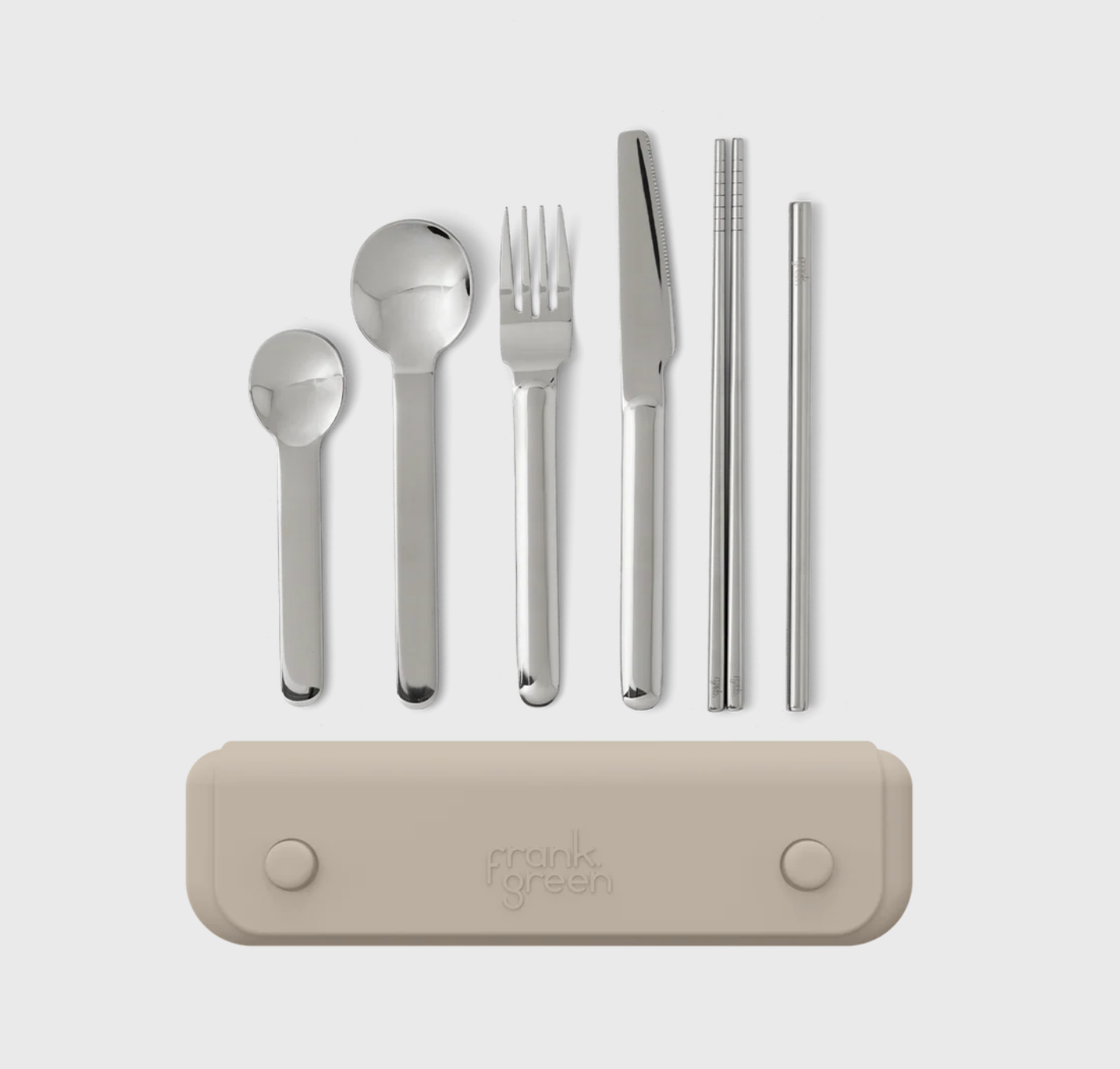 Your complete on-the-go set includes: knife, fork, soup spoon, teaspoon, chopsticks, straw & pouch.