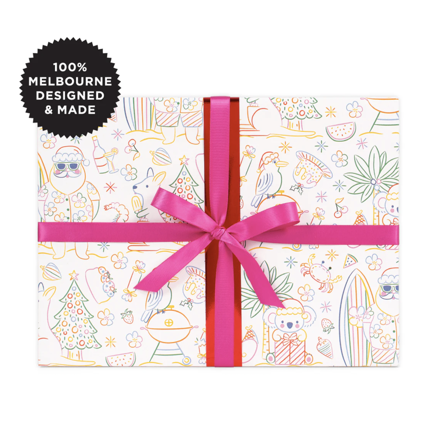 Celebrate an Aussie Christmas with Coogee Christmas. This vibrant wrapping paper featuring bright linework illustrations of beachy holiday fun—think surfing Santas, sandy kangaroos and festive cockatoos wearing santa hats. A playful and sun-soaked twist on the traditional Christmas theme printed on white semi gloss wrapping paper.