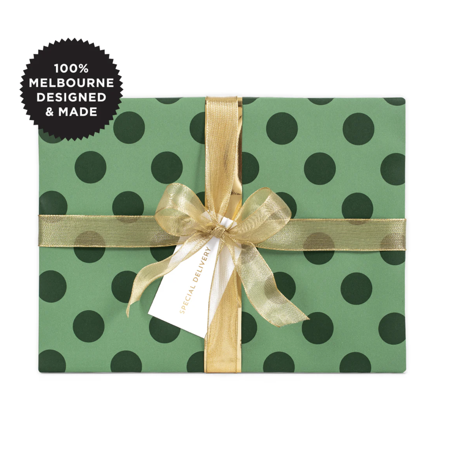 Large Dot Green features large dark green dots over a mid-green background, printed on matt white wrapping paper..