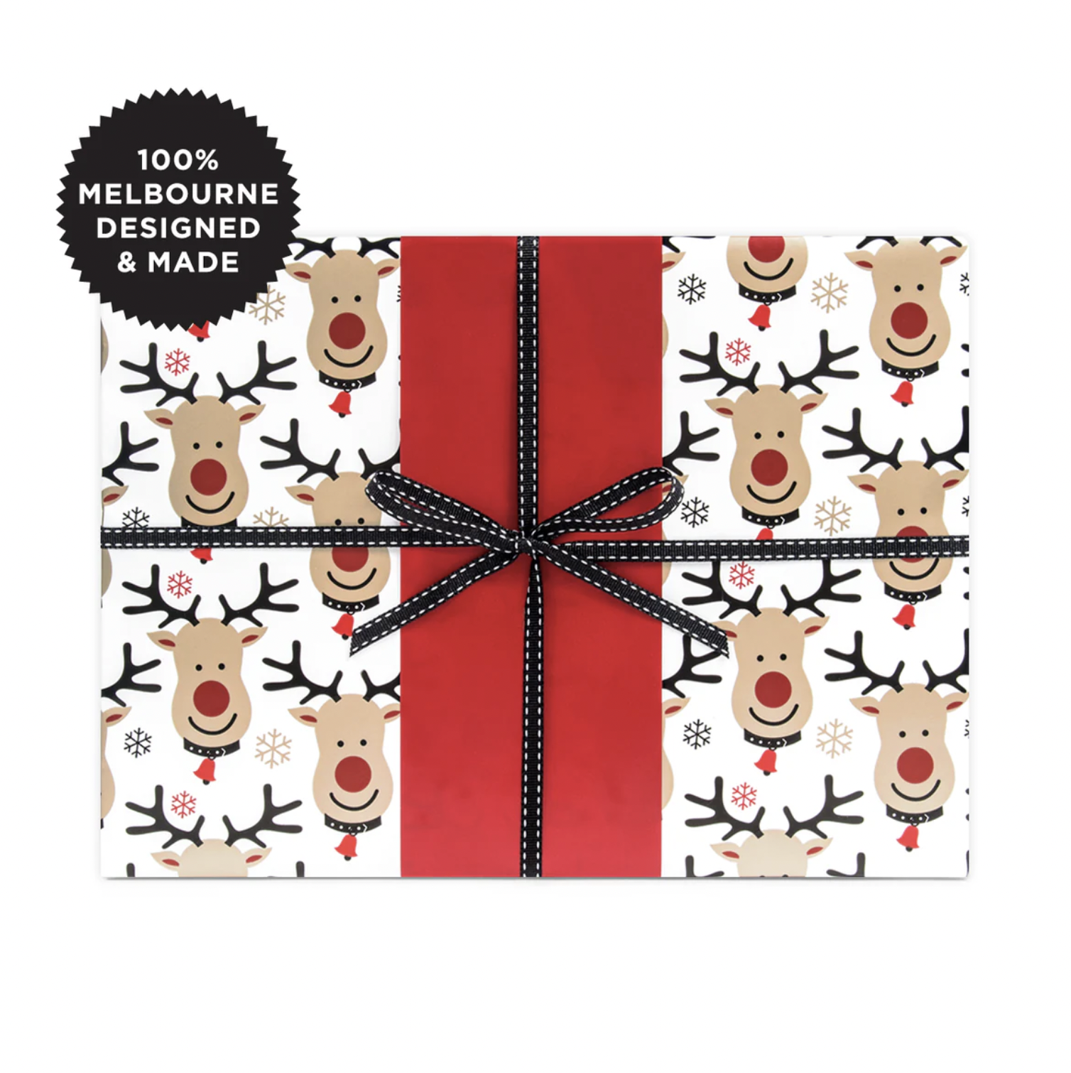Rudolph is the perfect children's Christmas pattern featuring red, black and latte inks on white semi gloss wrapping paper.