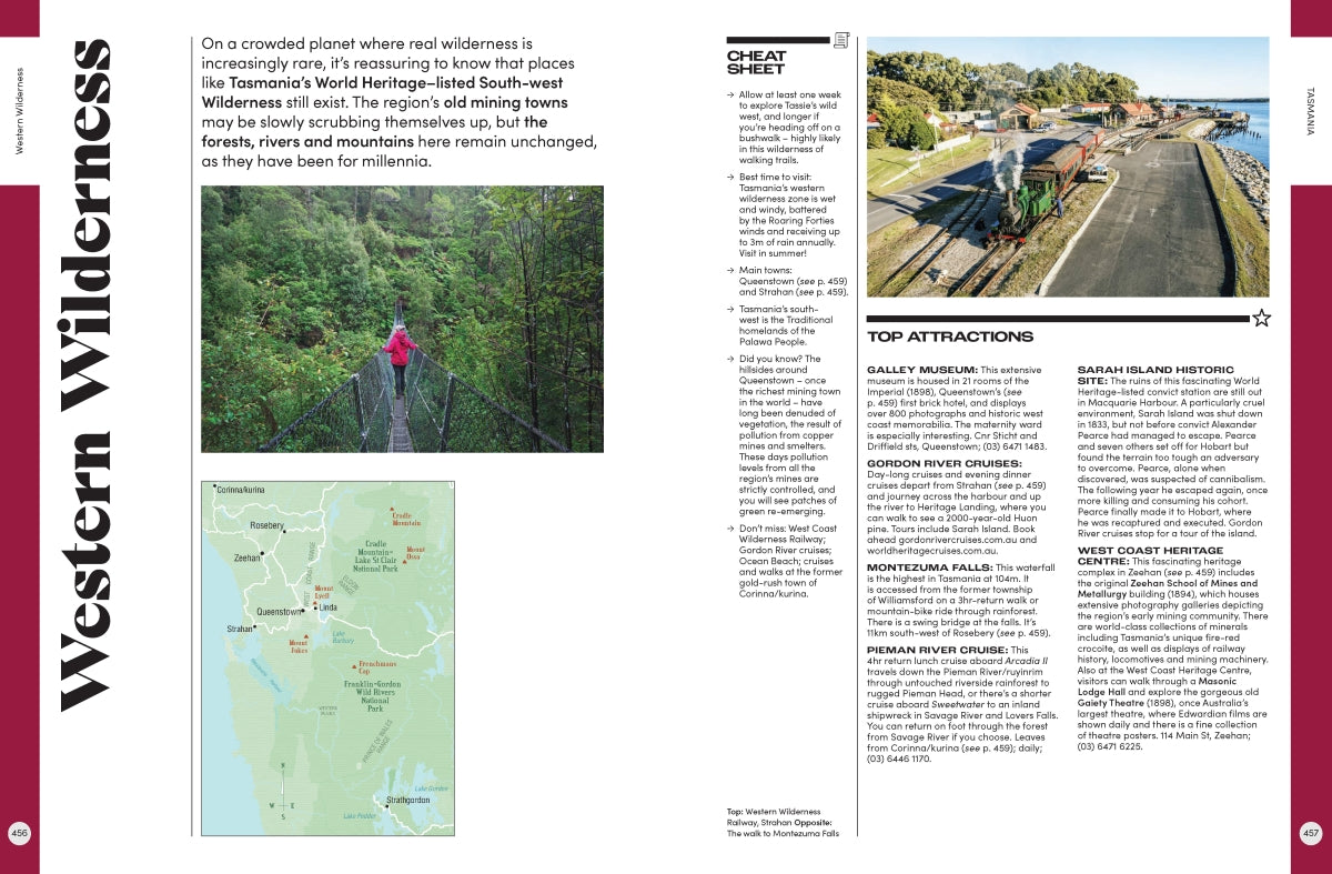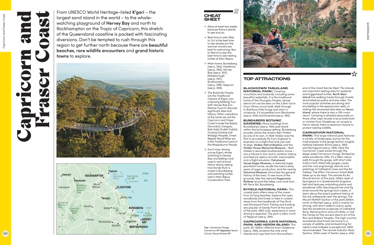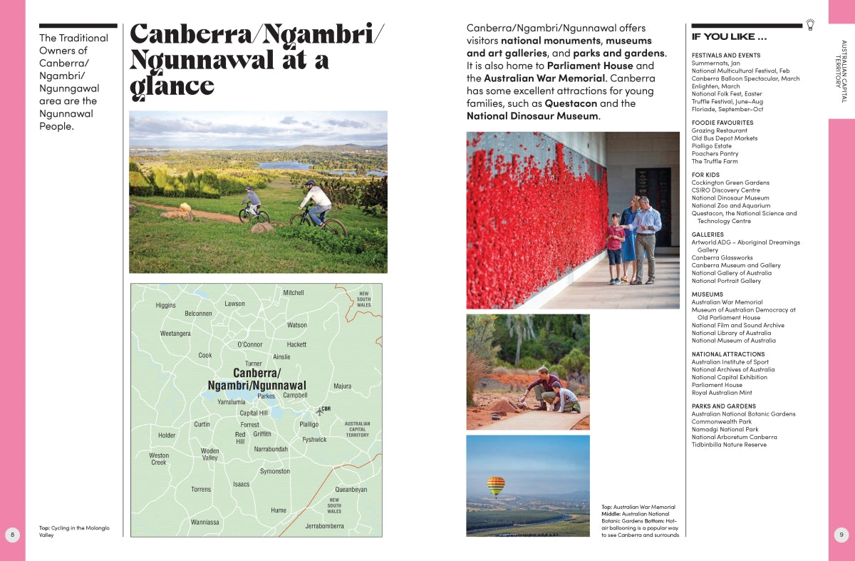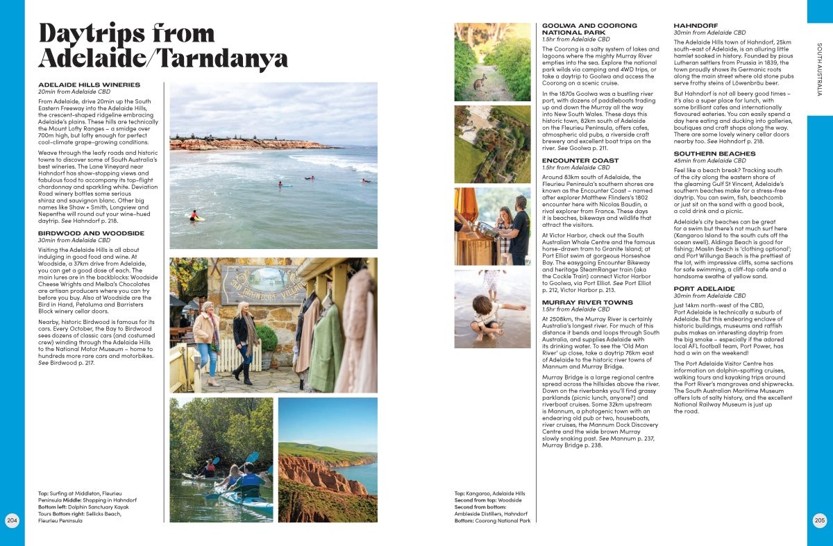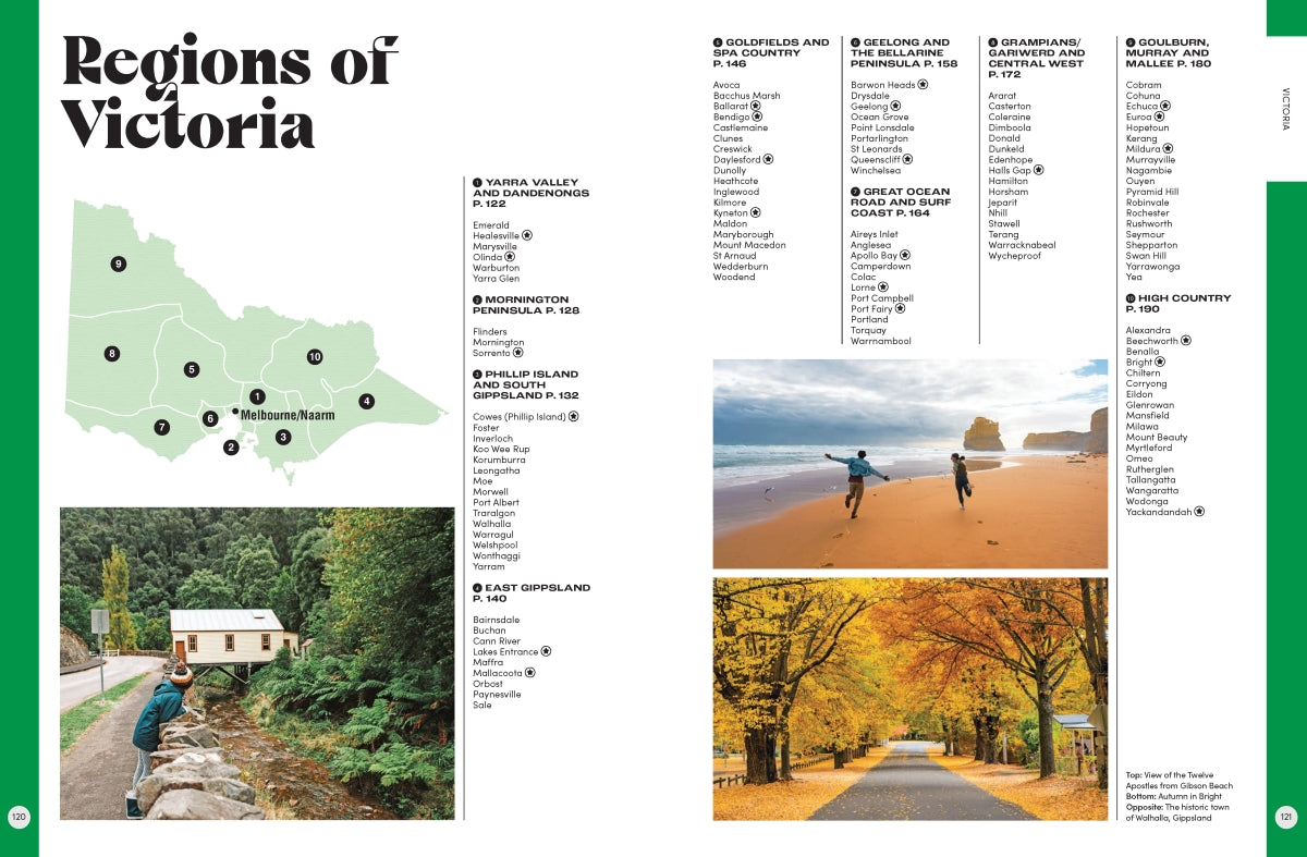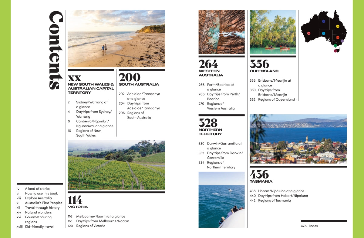 Each entry includes a summary of the best things to see and do, a handy map to make itinerary planning easy and a snapshot of major festivals and events. The useful information is accompanied by stunning photography, providing a look at some of Australia's most picturesque travel destinations. You can also find information on Australia's First Peoples, the best food and wine locations, and the country's top natural wonders.