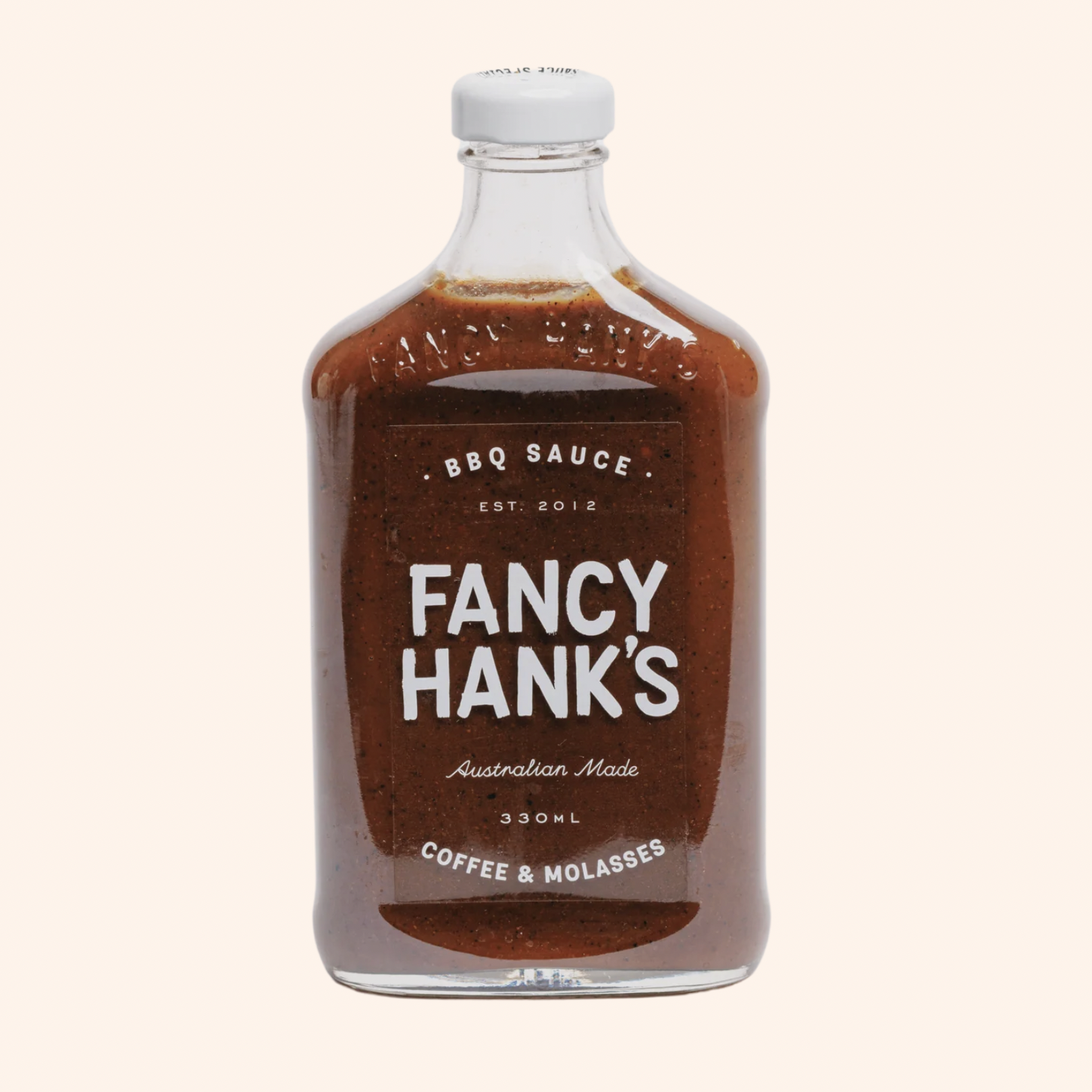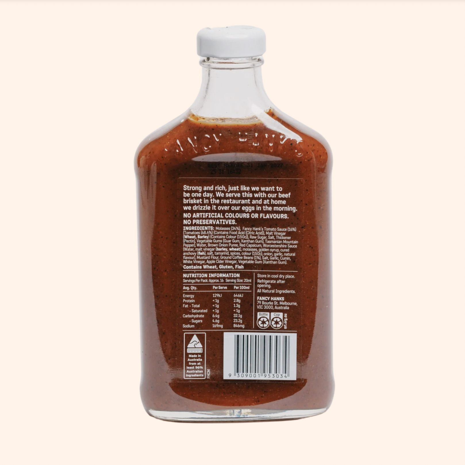 Molasses (34%), Fancy Hank's Tomato Sauce (16%) (Tomatoe (68.6%) (Contains Food Acid (Citric Acid)), Malt Vinegar (Wheat, Barley) (Contains Colour (150c)), Raw Sugar, Salt, Thickener (Pectin), Vegetable Gums (Guar Gum, Xanthan Gum), Tasmanian Mountain Pepper), Water, Brown Onion Puree, Red Capsicum, Worcestershire Sauce (Water, malt vinegar (barley, wheat), molasses, golden syrup, cured anchovy (fish), salt, tamarind, spices, colour (150c), onion, garlic, natural flavour), Mustard Flour, Ground Coffee Beans (1%), Salt, Garlic, Cumin, White Vinegar, Apple Cider Vinegar, Vegetable Gum (Xanthan Gum).