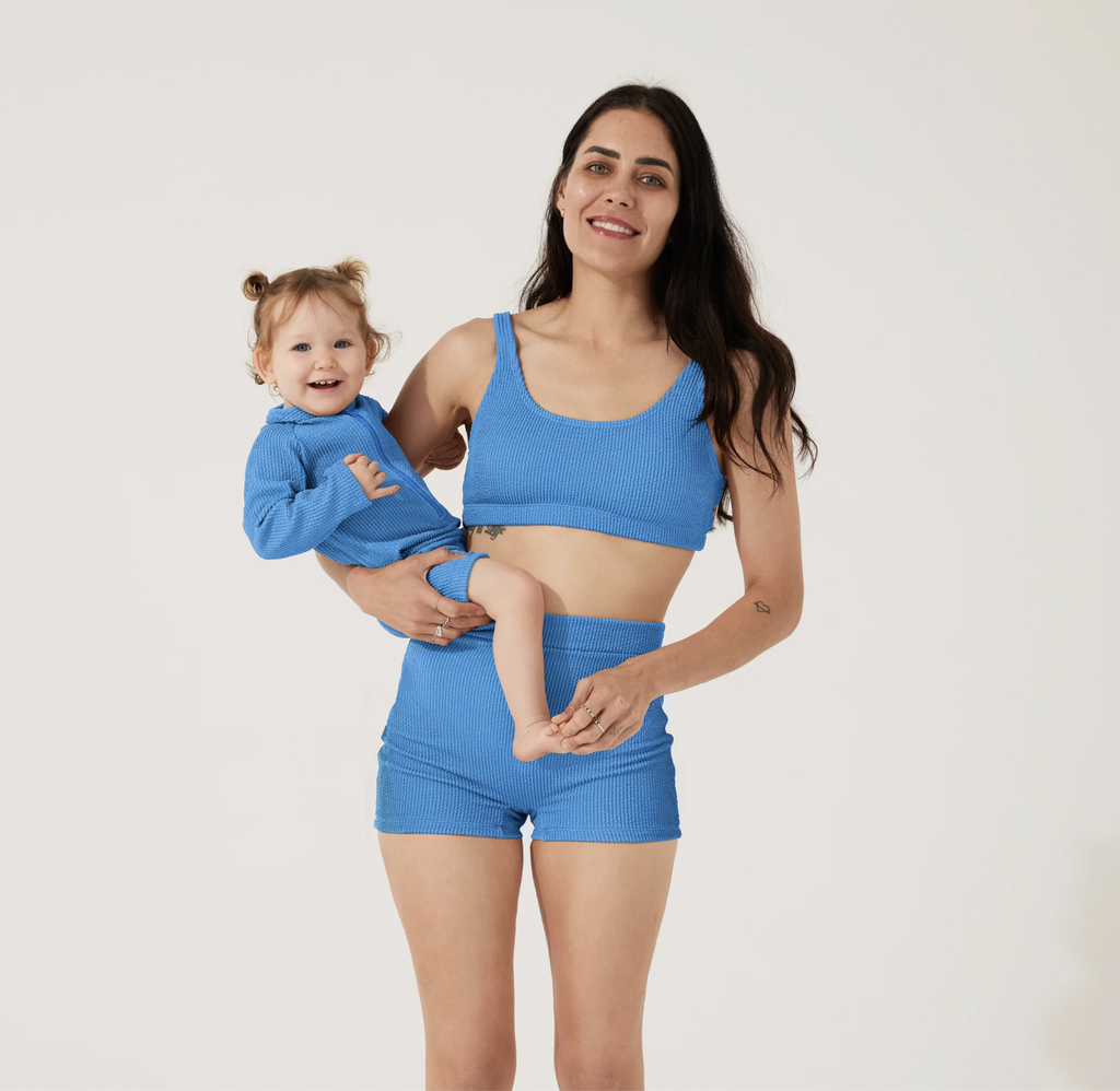 The Lagoon Embrace Swim Crop is crafted from our signature recycled crinkle fabric for softness, stretch, and all-day comfort. Fully lined and breastfeeding-friendly, it features a hidden pocket for nursing pads and a soft elastic under-bust band for a secure fit. The rich blue shade pairs beautifully with the Lagoon Embrace Swim Bottoms.