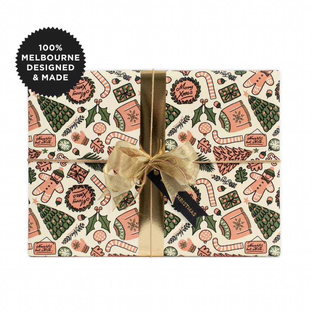 Xmas Wonderland is a modern Christmas themed pattern featuring green, black and peach inks printed on matte white wrapping paper.