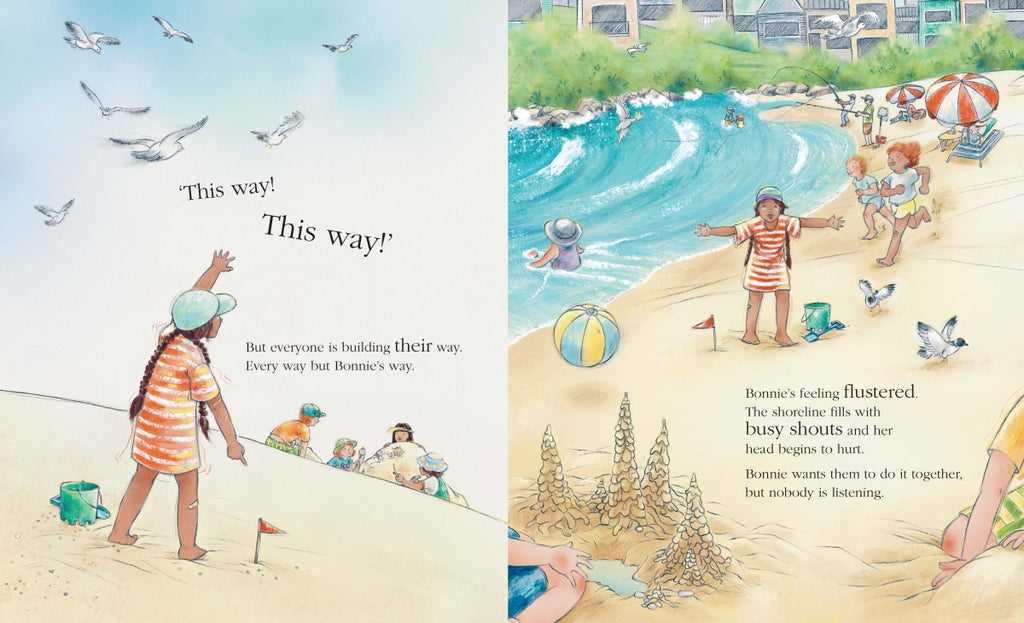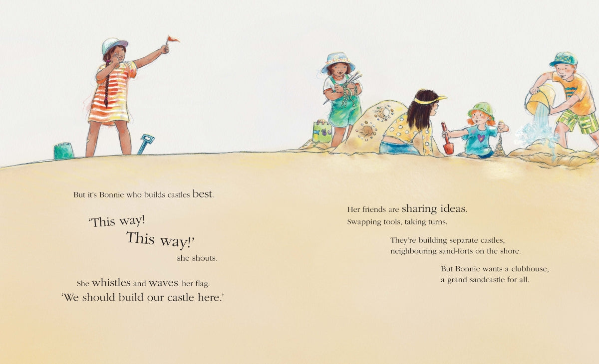 Bonnie knows how to build sandcastles best, but her friends insist on building their own castles every way but Bonnie's way. They sift and sculpt and burrow in the soft, white sand, happily playing by their own rules. No-one listens to Bonnie. Soon, her anger boils over and she storms off across the dunes.