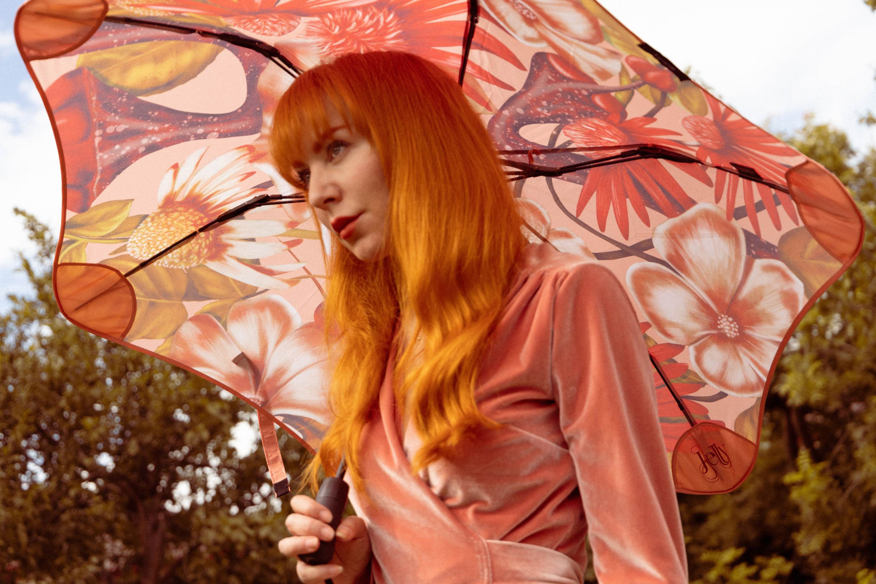 This collaboration marks Kelly Thompson’s second venture with BLUNT. A masterpiece that seamlessly blends earthy hues with delicate florals. As raindrops delicately dance across the canopy, this design beckons you to embrace the season in style.