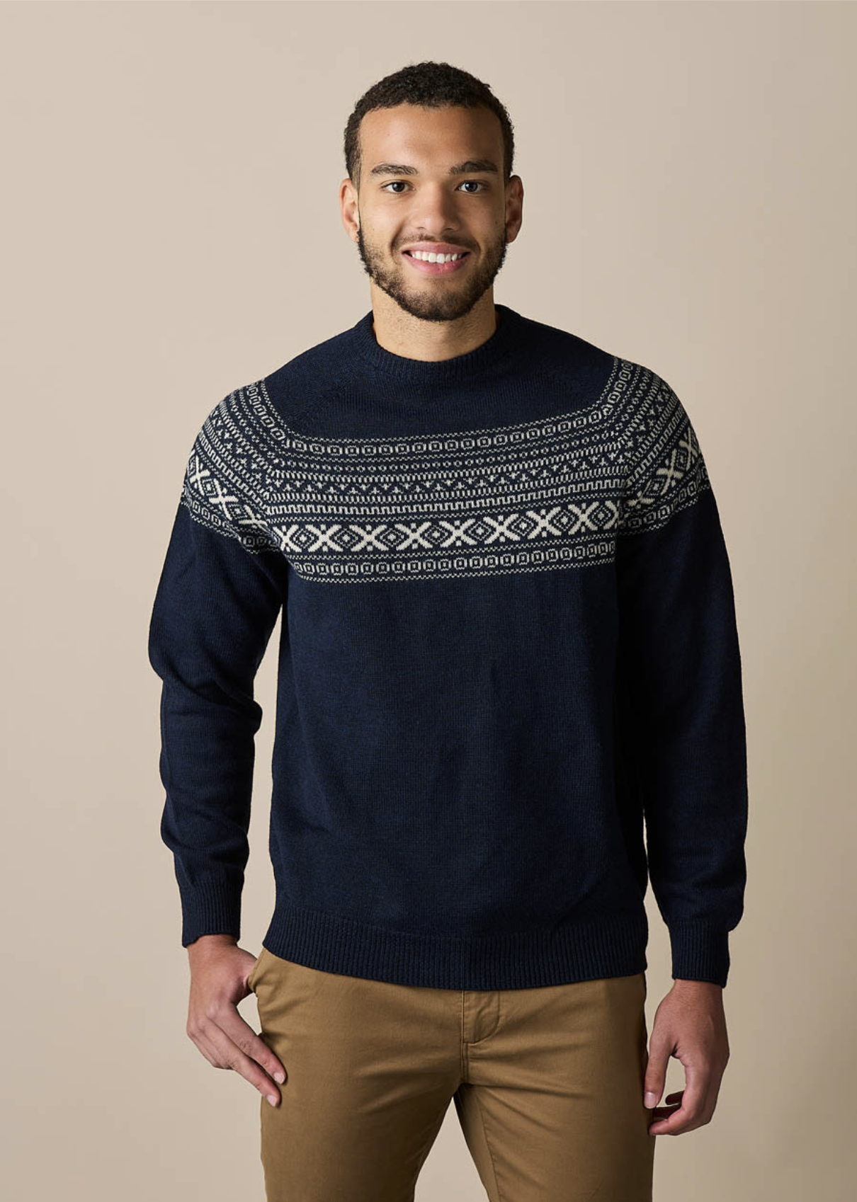 Embrace the spirit of authentic Nordic knitwear with our Finn Jumper, featuring a traditional Fair Isle pattern in rich, seasonal hues. Crafted from luxuriously soft Merino wool, this piece offers natural warmth, breathability, and incredible softness against the skin. With a refined, contemporary fit, it's ideal for layering over a shirt or worn solo with your favourite denim — either way, it's a standout essential for cooler days.