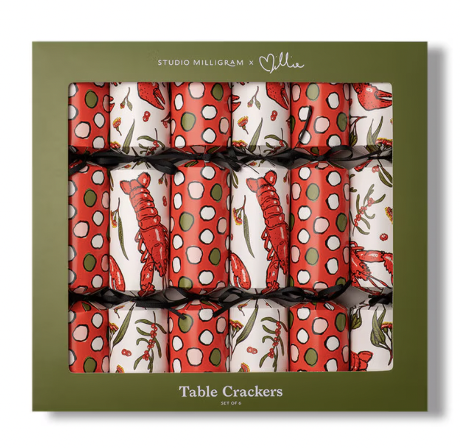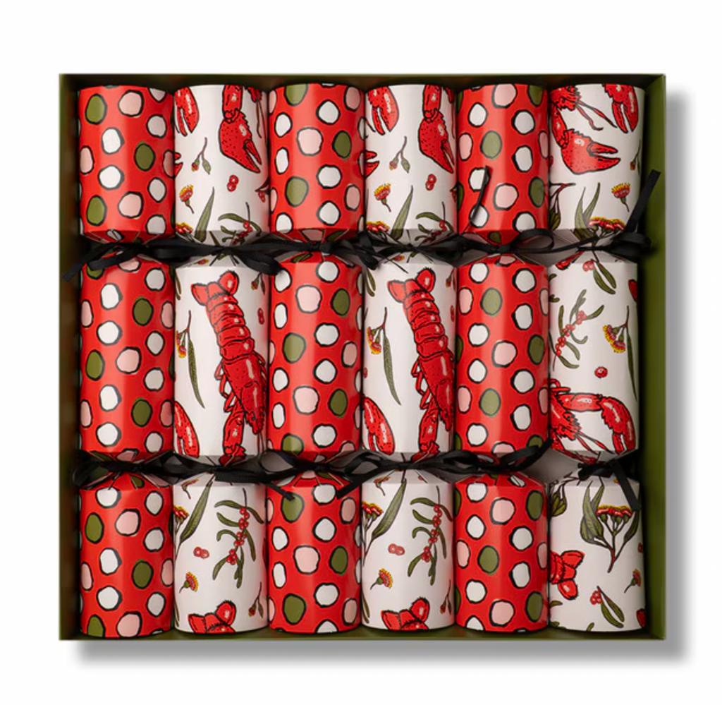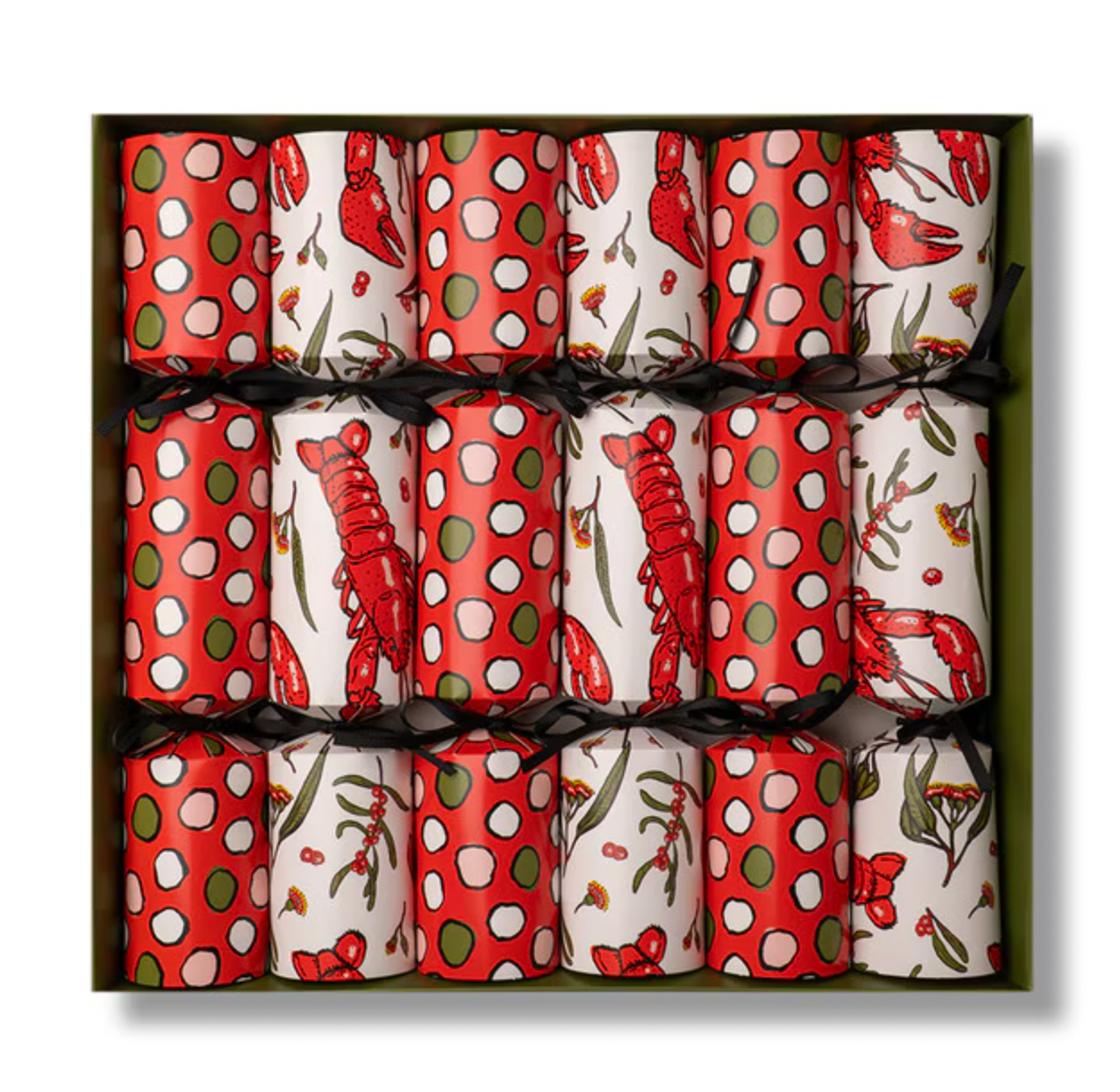 A beautiful set of 6 table crackers with original illustrations featuring lobsters, flowering eucalyptus and spots. Billie Justice Thomson is a visual artist known for vibrant depictions of iconic Australian imagery. Her work explores nostalgia through the memorialisation of sentimental common objects. Our collaborative collection with Billie celebrates familiar festive rituals with playful artworks that pay homage to lifes simple pleasures.