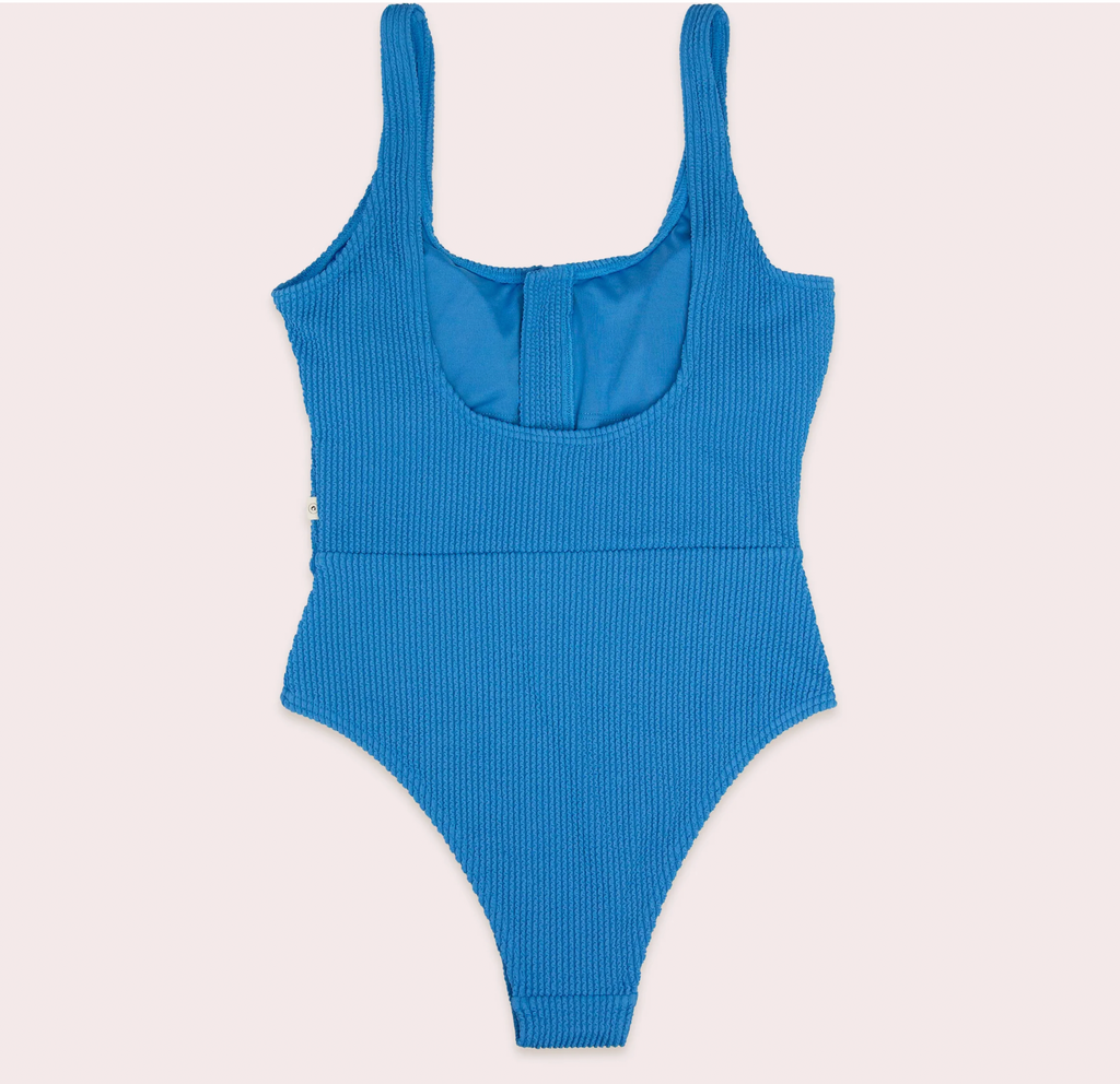 Medium coverage and a cut-away back add a modern edge to the ocean-blue finish