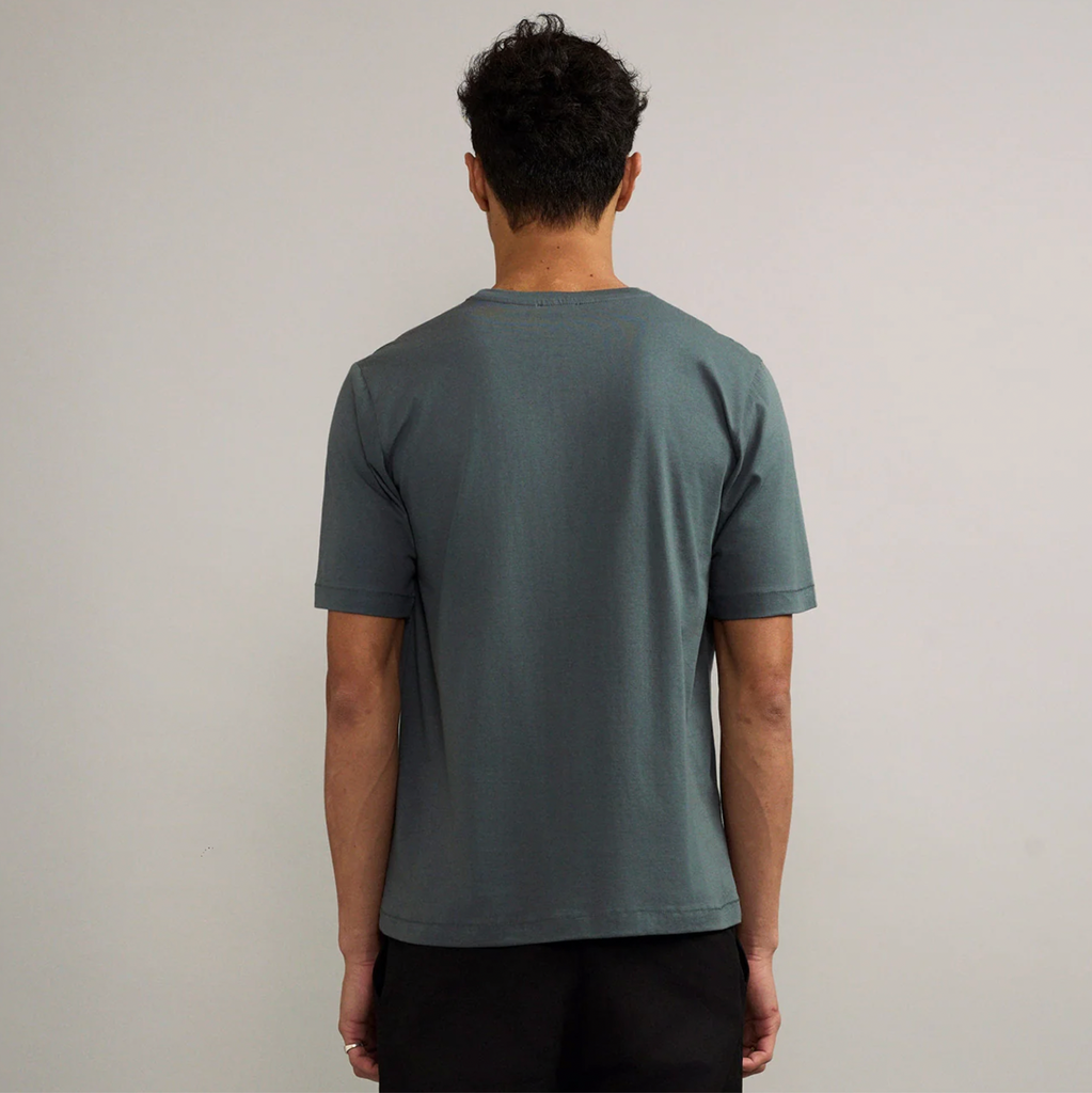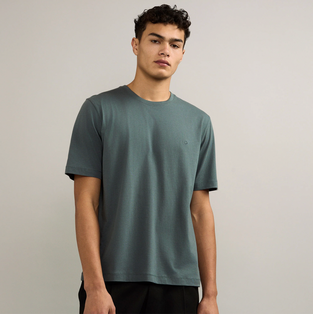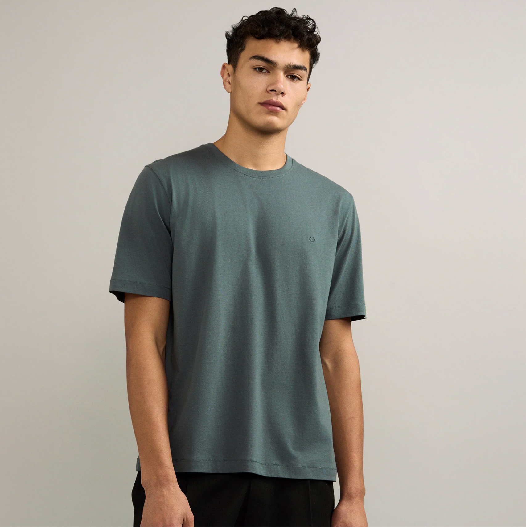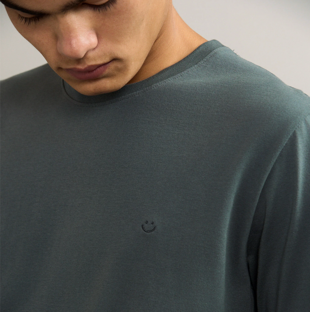 Classic tailored fit t-shirt with a traditional round neck. Half shoulder top stitch detail. Blind stitch finish on sleeves and hem. Smiley embroidery. Made using our signature certified 100% organic cotton jersey and pre-washed for a premium ready to wear finish.