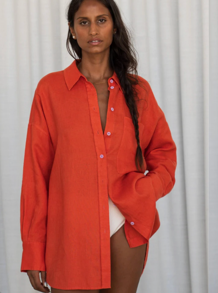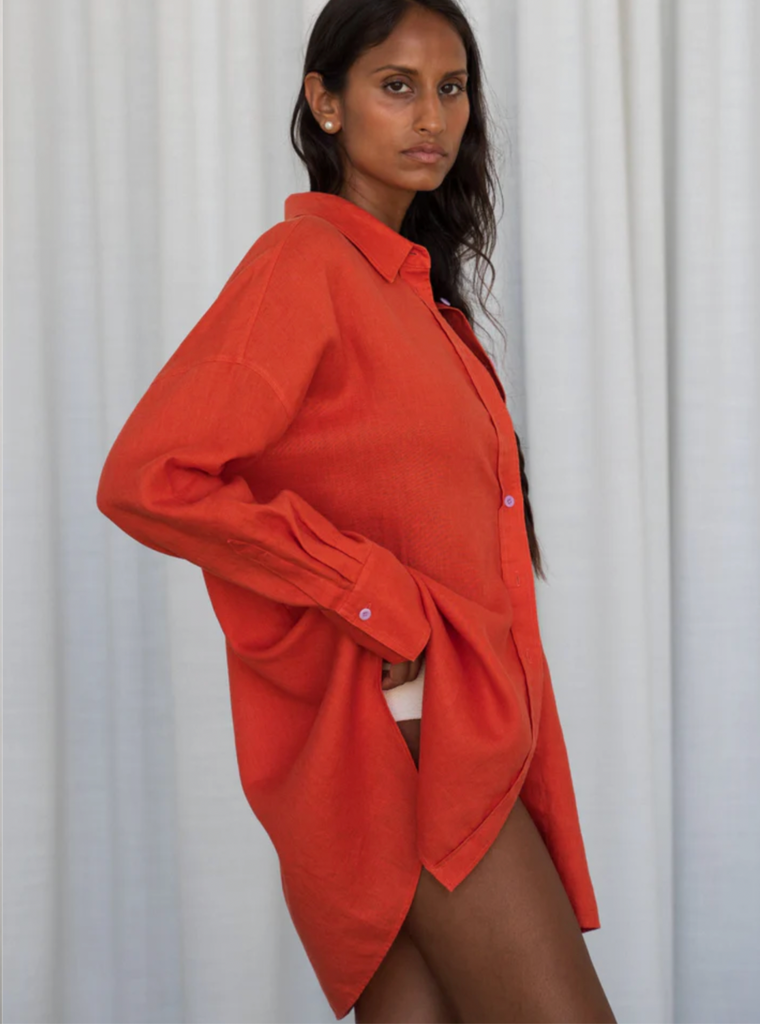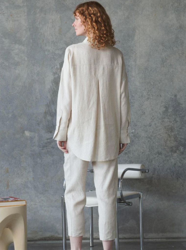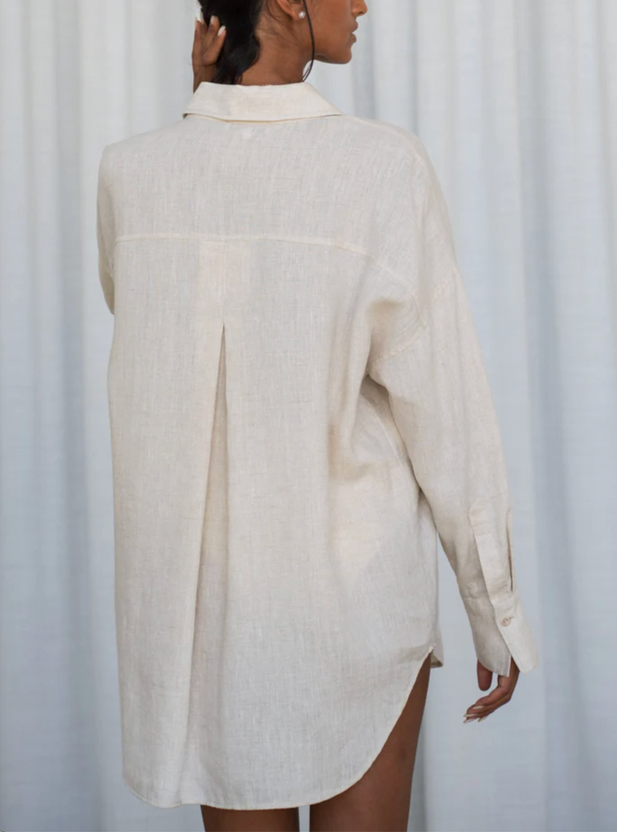 Our signature shirt KIRRA is our all year round wardrobe staple. This oversized shirt features a hi-low curved hem for a flattering fit, and natural buttons made from Corozo, Coconut, or Shell. Dress it up or down with our OLI linen pants, layer under our JUNE cashmere knit or throw it on as a beach cover up.
