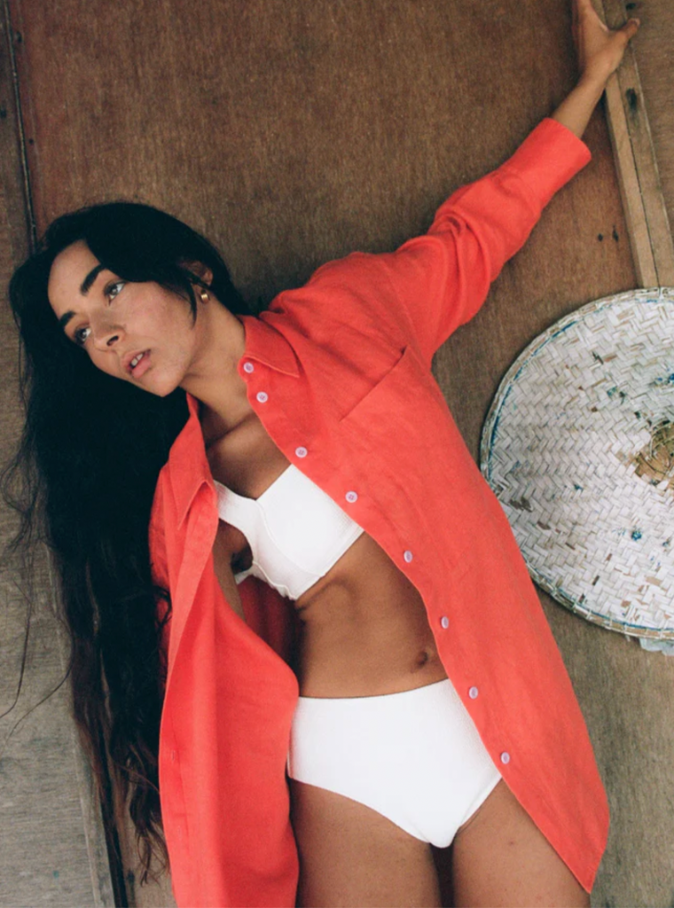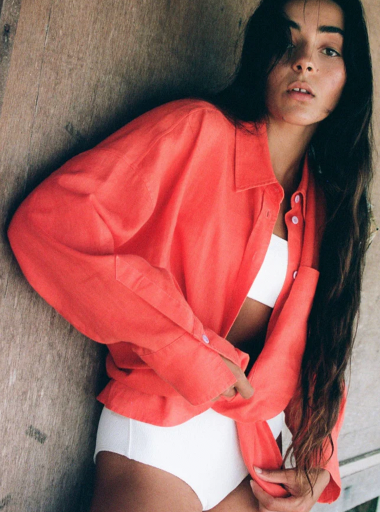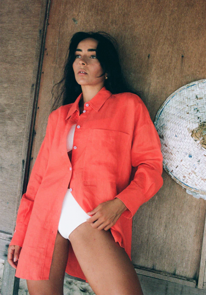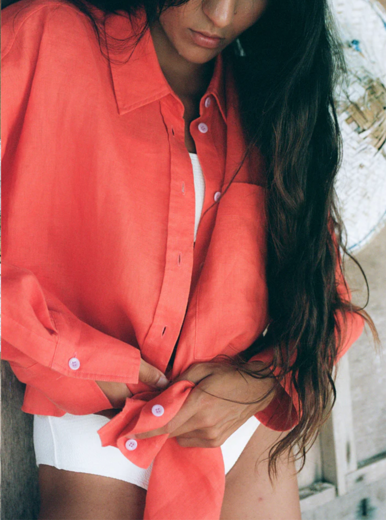 Our signature shirt KIRRA is our all year round wardrobe staple. This oversized shirt features a hi-low curved hem for a flattering fit, and natural buttons made from Corozo, Coconut, or Shell. Dress it up or down with our OLI linen pants, layer under our JUNE cashmere knit or throw it on as a beach cover up.